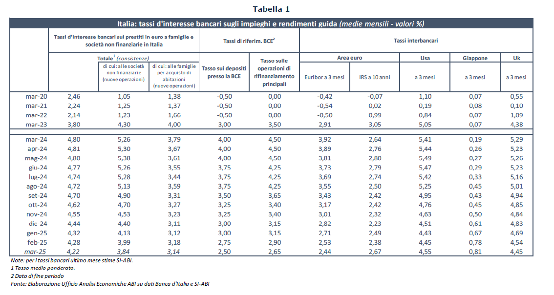 ABI: TASSI DI INTERESSE SUI PRESTITI A FAMIGLIE E IMPRESE – MARZO 2025