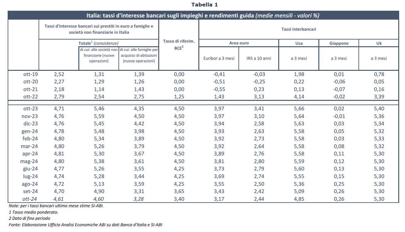 - il tasso medio sulle nuove operazioni per acquisto di abitazioni è diminuito al 3,28%, rispetto al 3,31% di settembre 2024 e in calo rispetto al 4,42% di dicembre 2023;