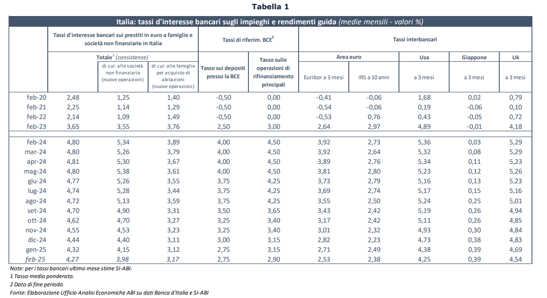 ABI: TASSI DI INTERESSE SUI PRESTITI BANCARI A FAMIGLIE E IMPRESE FEBBRAIO 2025