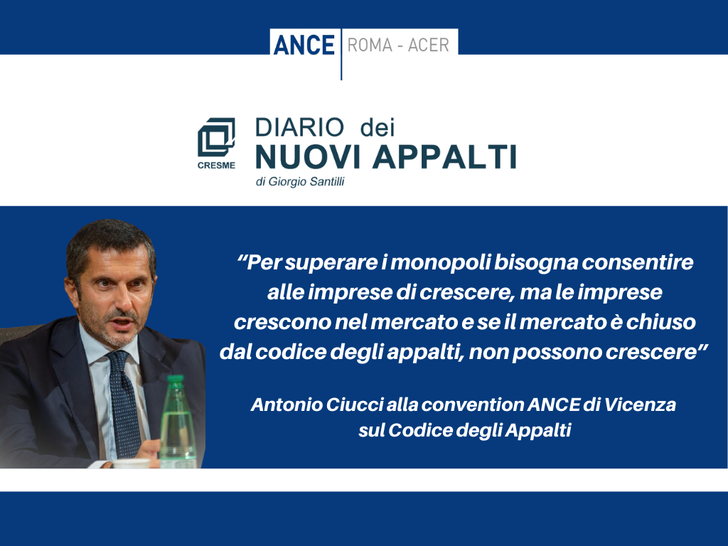 Codice appalti, l’intervento del Presidente Ciucci alla convention Ance di Vicenza ripreso da “Diario Nuovi Appalti”: “Aprire il mercato alla concorrenza per far crescere le imprese, serve subito un correttivo al Codice”