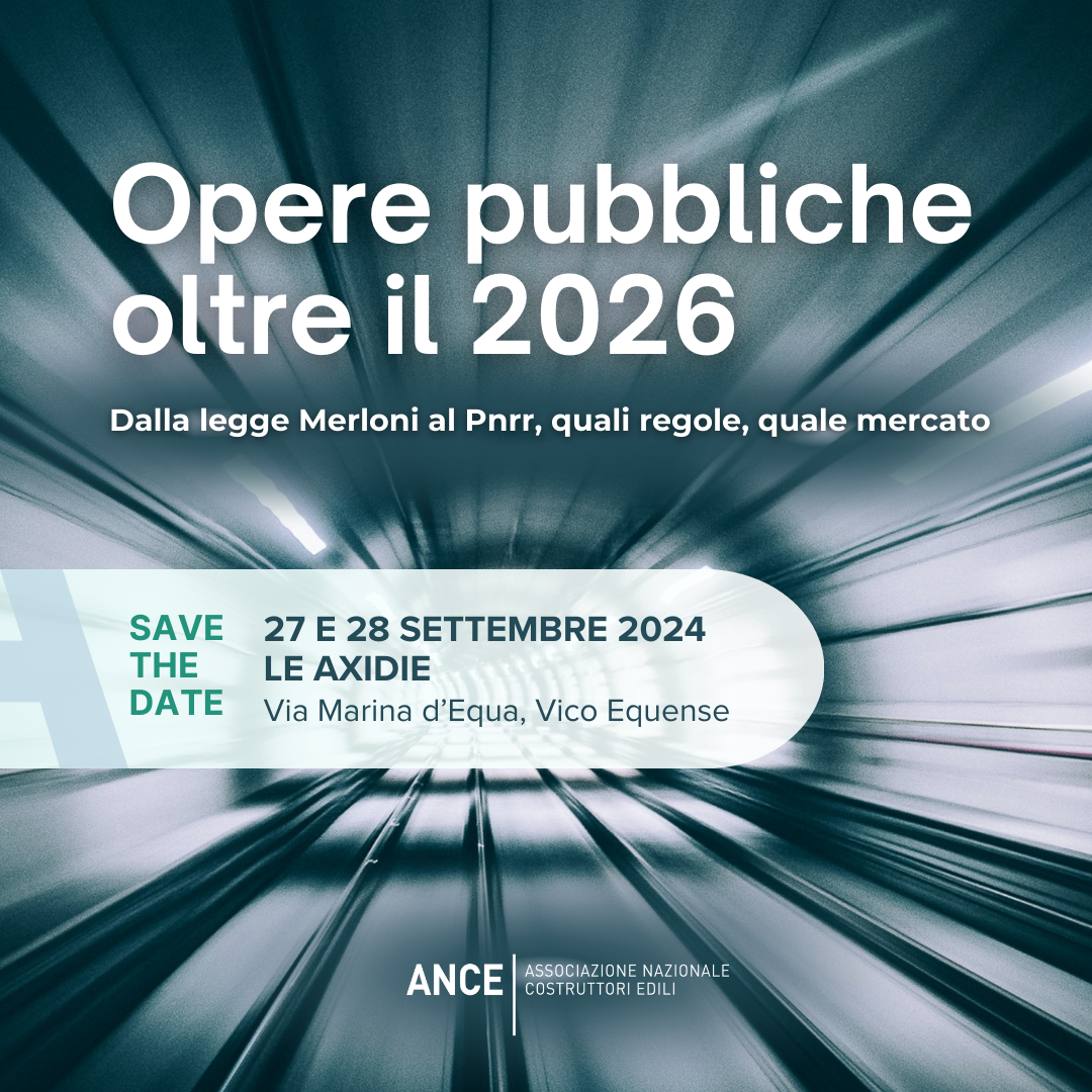 “Opere pubbliche oltre il 2026. Dalla legge Merloni al Pnrr, quali regole, quale mercato“ è il titolo del convegno di quest’anno dedicato ai lavori pubblici organizzato da Ance, che si terrà il 27 e 28 settembre a Vico Equense presso l’Hotel & Resort Le Axidie.