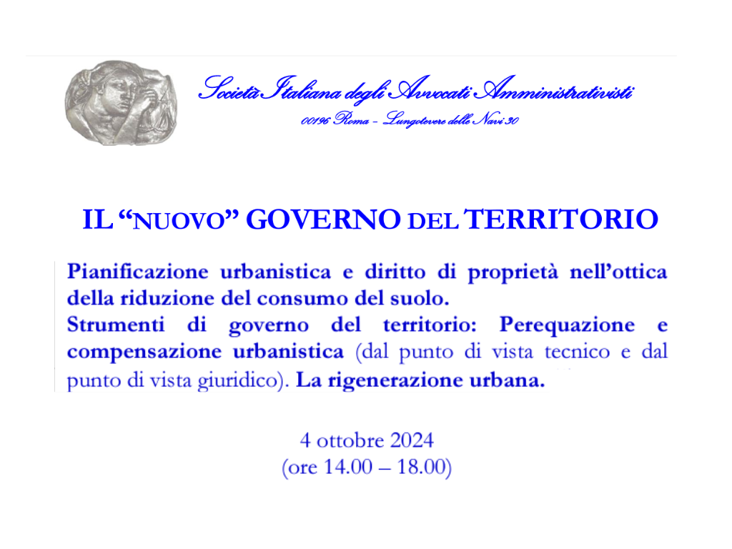 A partire da venerdì 27 settembre, la Società Italiana degli Avvocati Amministrativisti ha organizzato un corso su Il “nuovo” Governo del territorio. Cinque le sessioni previste da seguire in videoconferenza “da remoto”, in modalità FAD (Formazione a Distanza – videoconferenza in diretta streaming) e in presenza presso la sede della SIAA, a Roma. Il programma dei corsi e i moduli online per le iscrizioni sono disponibili sul sito della Società Italiana degli Avvocati Amministrativisti (www.siaaitalia.it). Per qualsiasi ulteriore informazione scrivere una mail a segreteria@siaaitalia.it oppure contattare il 349-1530432