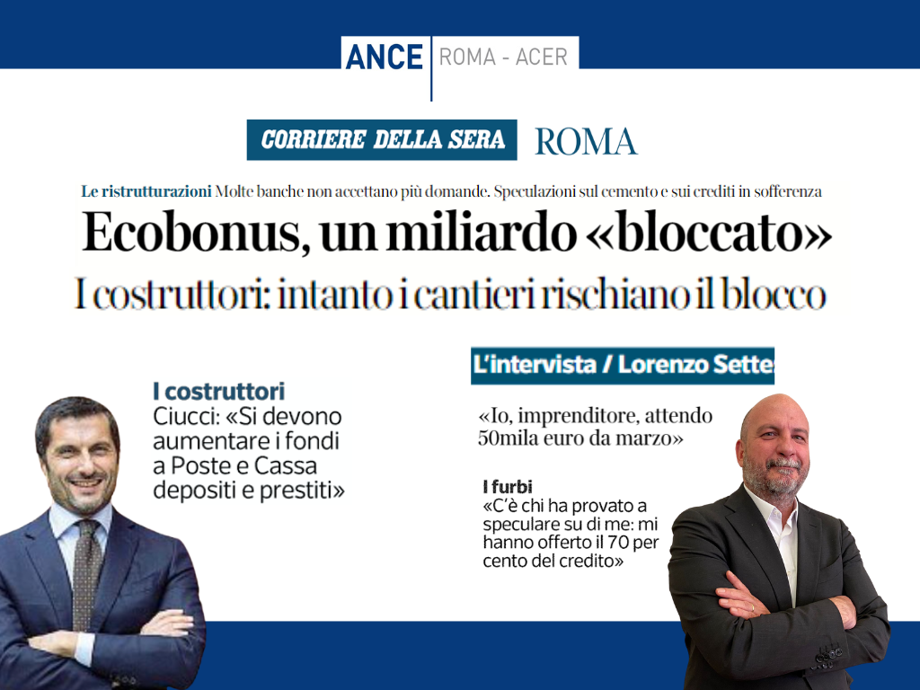 “Ogni giorno riceviamo messaggi dai nostri iscritti avvicinati da terze parti disposte a comprare il credito all’86% mentre le banche lo pagano al 102%. Si rischia il blocco del mercato. Le aziende non riescono più ad anticipare le spese dei preventivi e vengono accordati loro meno prestiti ponte. Occorre aumentare i fondi a disposizione e fare in modo che Poste Italiane e Cassa depositi e prestiti riprendano gli acquisti. Ma soprattutto bisogna eliminare il principio della responsabilità solidale“. A lanciare l’appello dalle pagine del Corriere della Sera di Roma è il Presidente di Ance Roma – ACER Antonio Ciucci. Il quotidiano pubblica anche un’intervista all’imprenditore e Vicepresidente di Ance Roma – ACER Lorenzo Sette, in attesa di un rimborso di 50mila euro per lavori ultimati nel 2021. I due articoli sono disponibili di seguito e online sul sito del Corriere: https://roma.corriere.it/notizie/cronaca/22_settembre_02/ecobonus-lazio-bloccato-miliardo-euro-banche-stop-crediti-99a46b3e-2a9a-11ed-8fa9-879da6ca29ec.shtml