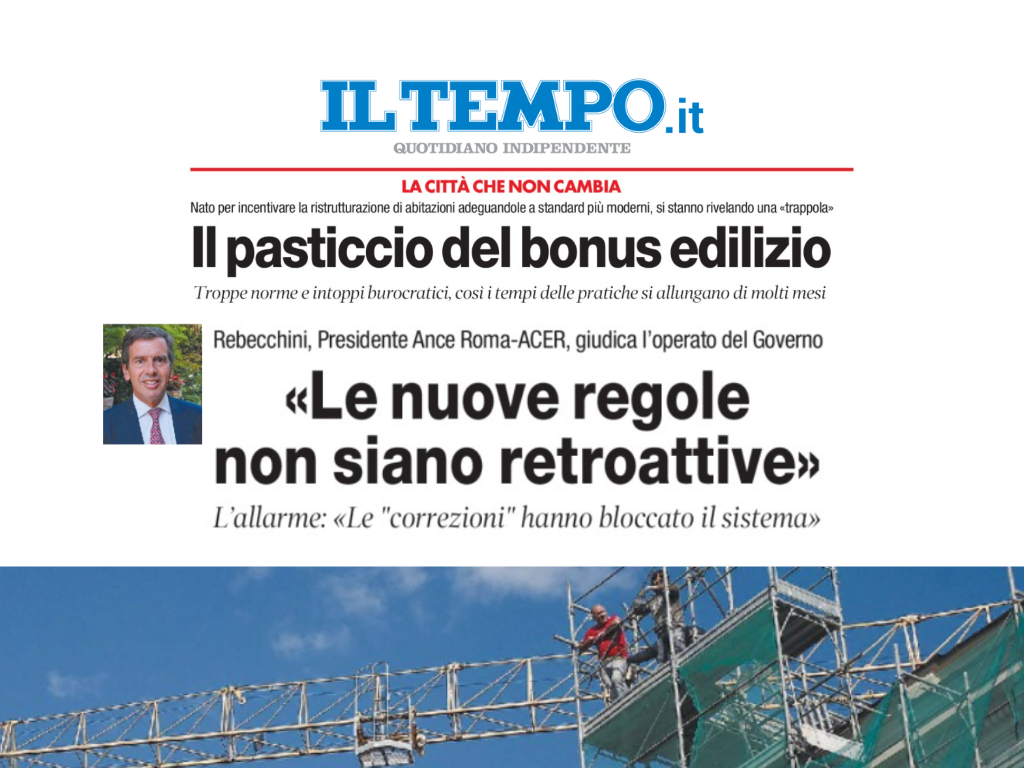 Bonus edilizi ostaggi di norme e burocrazia. Le misure del Governo, nate come agevolazioni, si stanno trasformando in un ginepraio di intoppi. Con il “Decreto Sostegni Ter” e con la conferma dei nuovi vincoli per la cessione del credito, il sistema si è bloccato. In un’intervista al quotidiano “Il Tempo”, il Presidente Ance Roma – ACER, Nicolò Rebecchini lancia l’allarme dell’Associazione dei costruttori romani e chiede al Governo di modificare le regole prima che quello che era stato annunciato come un provvedimento salvifico per il comparto diventi un boomerang per imprese e cittadini. Di seguito, l’articolo e l’intervista al Presidente, in pagina su “Il Tempo”.