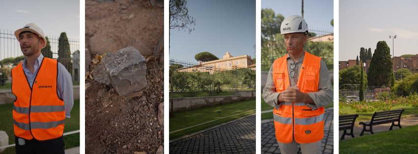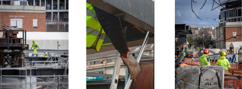 Ad accompagnarci, l’Architetto Adriano Draghini. “Ho scelto di fare l’architetto di cantiere, in cantiere – ci ha spiegato – perché si può toccare con mano l’evoluzione di quello che facciamo” ed è forse mosso dalla stessa motivazione anche Marco, neolaureato in Architettura e oggi giovane supporto tecnico in SAC, che dai banchi dell’Università di Roma Tre – davanti all’area di cantiere – è passato al di là della transenna, con caschetto e fogli, pronto a mettersi all’opera.