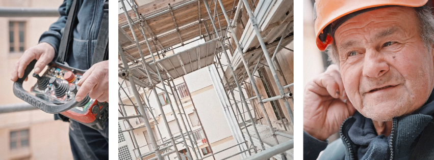 Nel video compare: Pierangelo Tiberi (tecnico), Guillaume Bolduc (restauratore) e altri dipendenti dell’impresa a lavoro nel cantiere