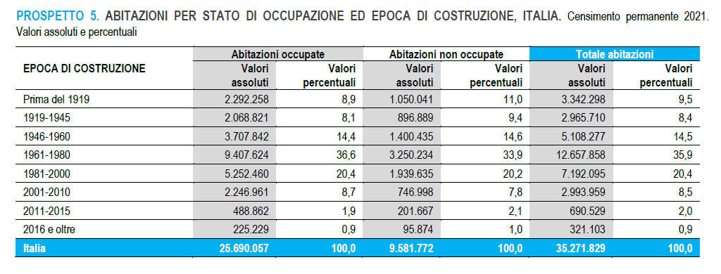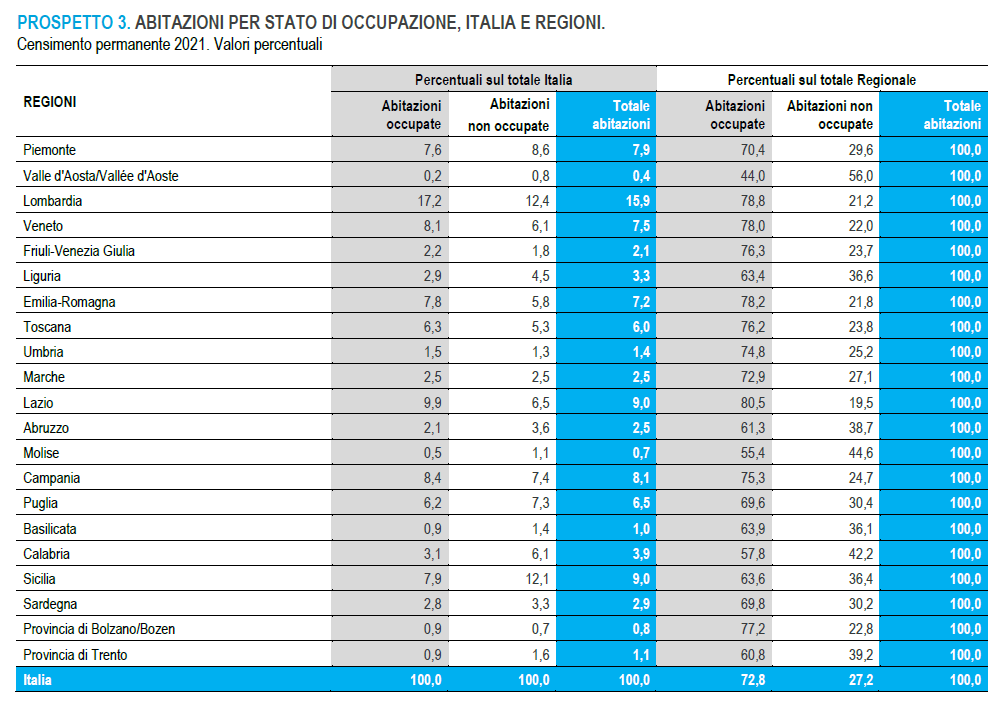 Secondo il censimento Istat, il numero complessivo delle abitazioni presenti in Italia al 2021 è di 35.271.829 unità: quelle occupate da almeno una persona residente sono naturalmente la gran parte e ammontano a 25.690.057, pari al 72,8% delle abitazioni totali; le non occupate (che comprendono sia le abitazioni vuote sia quelle occupate solo da persone non residenti) sono 9.581.772 e corrispondono al 27,2% delle abitazioni complessive.