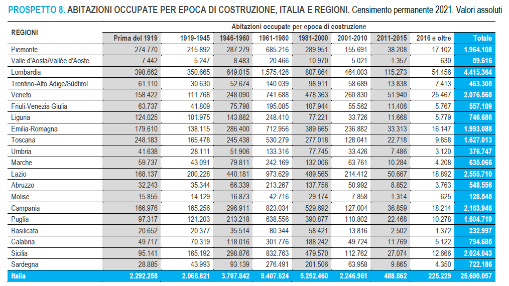 A livello regionale, la Lombardia ospita le quote più elevate di abitazioni edificate in Italia, il 15,9% delle abitazioni totali e il 17,2% delle abitazioni occupate, seguono la Sicilia (9,0% di abitazioni totali e circa l’8% di abitazioni occupate) e il Lazio (9,0% di abitazioni totali e quasi il 10% di abitazioni occupate).