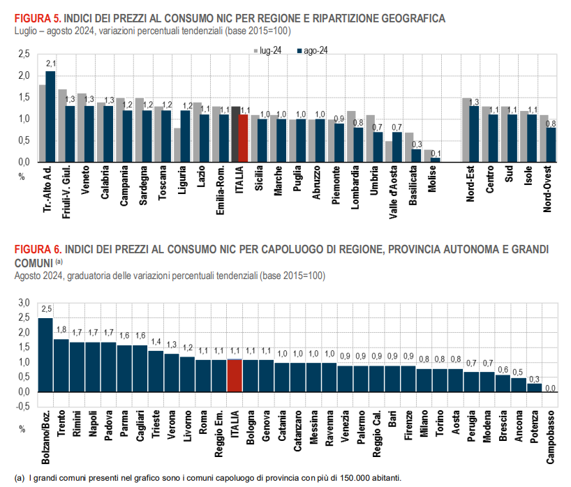Nel mese di agosto 2024, secondo le rilevazioni dell’Istat, l’indice nazionale dei prezzi al consumo per l’intera collettività (NIC), al lordo dei tabacchi, aumenta dello 0,2% su base mensile e dell’1,1% su base annua (da +1,3% del mese precedente).