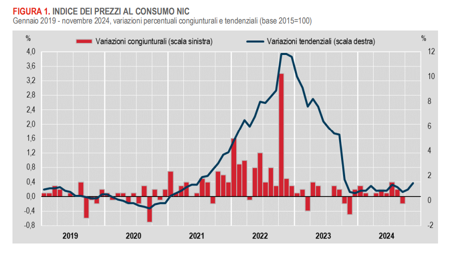 Secondo le stime preliminari dell’Istat, nel mese di novembre 2024 l’indice nazionale dei prezzi al consumo per l’intera collettività (NIC), al lordo dei tabacchi, registra una variazione su base mensile nulla e aumenta dell’1,4% su base annua, dal +0,9% del mese precedente.