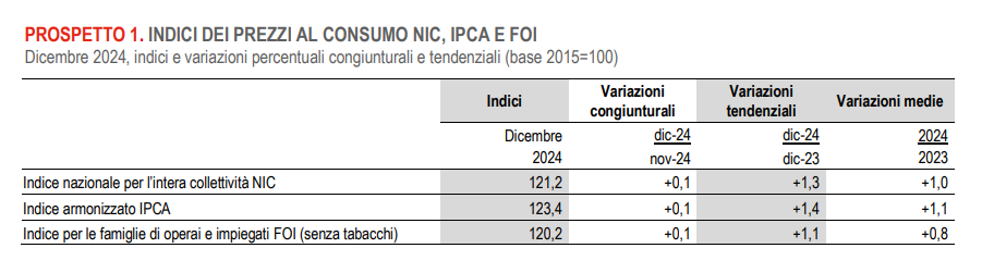 Nel mese di dicembre 2024, l’ISTAT stima che l’indice nazionale dei prezzi al consumo per l’intera collettività (NIC), al lordo dei tabacchi, registri un aumento dello 0,1% su novembre e dell’1,3% su dicembre 2023.