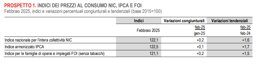 Nel mese di febbraio 2025, secondo il rapporto ISTAT, l’indice nazionale dei prezzi al consumo per l’intera collettività (NIC), al lordo dei tabacchi, aumenta dello 0,2% rispetto a gennaio 2025 e dell’1,6% rispetto a febbraio 2024 (da +1,5% del mese precedente); la stima preliminare era +1,7%.