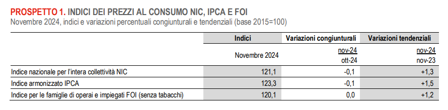 Nel mese di novembre 2024, secondo l’Istat, l’indice nazionale dei prezzi al consumo per l’intera collettività (NIC), al lordo dei tabacchi, diminuisce dello 0,1% su base mensile e aumenta dell’1,3% su base annua (da +0,9% del mese precedente),tornando allo stesso livello del luglio scorso; la stima preliminare era +1,4%.