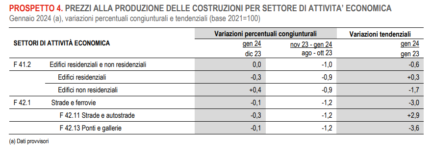 A gennaio 2024, secondo l’Istat, i prezzi alla produzione delle costruzioni per “Edifici residenziali e non residenziali” rimangono invariati su base mensile e flettono dello 0,6% su base annua. I prezzi di “Strade e Ferrovie” diminuiscono dello 0,1% in termini congiunturali e del 3,0% in termini tendenziali.
