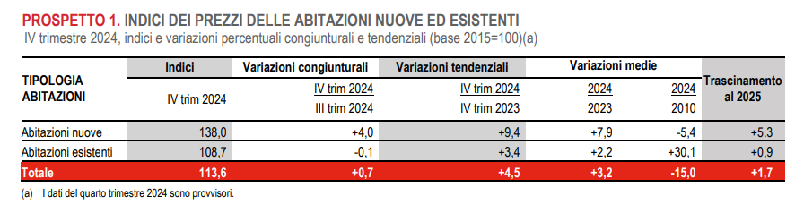 ISTAT: PREZZI DELLE ABITAZIONI (DATI PROVVISORI) – IV TRIMESTRE 2024