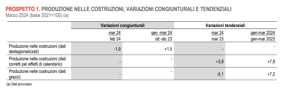 A marzo 2024 l’Istat stima che l’indice destagionalizzato della produzione nelle costruzioni diminuisca dell’1,9% rispetto a febbraio riportando i livelli al di sotto di quelli di novembre 2023.