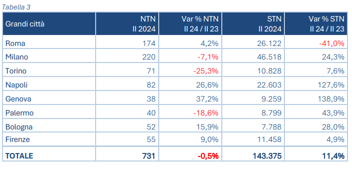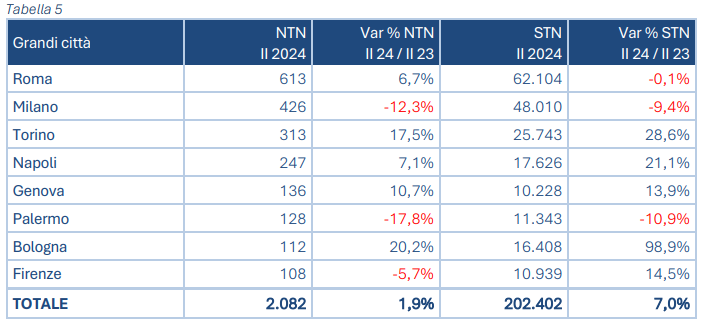 Il mercato delle grandi città riflette con qualche lieve differenza quello nazionale. In confronto al secondo trimestre 2023, il numero di negozi scambiati aumenta dell’1,9%. A rallentare la crescita complessiva è soprattutto la flessione del 12,3% registrata nel mercato di Milano che, per volumi transati, è secondo solo a Roma.
