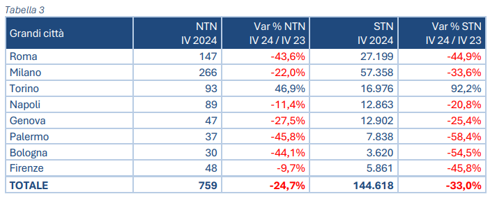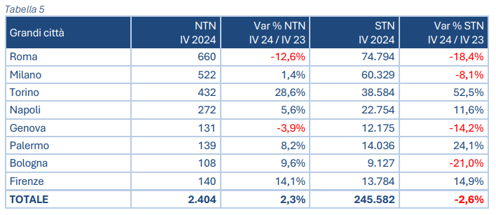 Nelle otto principali città italiane si registra, rispetto al IV trimestre del 2023, una forte diminuzione dei volumi, quasi il 25% in meno, e della relativa STN, in calo del 33%. Più nel dettaglio, Roma e Milano, che presentano i mercati più rilevanti per dimensione, perdono rispettivamente il 43,6% e il 22%.