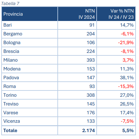 Sono 5.040 le unità a destinazione produttiva compravendute in Italia, l’1,1% in più rispetto allo stesso periodo del 2023. Analizzando il mercato nelle dodici province nelle quali è ubicata la maggior quota dello stock di questo settore, nel IV trimestre del 2024 il NTN aumenta complessivamente del 5,5%, nonostante si evidenzi un certo grado di disomogeneità tra le diverse realtà indagate.