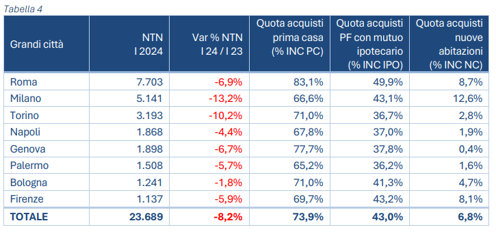 Anche le otto principali città italiane per popolazione evidenziano una variazione tendenziale annua negativa, lievemente più elevata del dato nazionale, con Milano e Torino che mostrano i cali più elevati, oltre il 10%. Più contenute le flessioni a Bologna e Napoli.