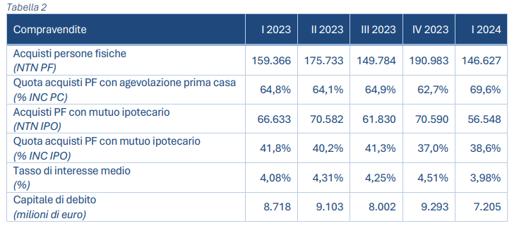 La quota di persone fisiche che hanno acquistato abitazioni ricorrendo a un mutuo ipotecario rimane al di sotto del 40%, anche se leggermente maggiore di quanto rilevato nello scorso trimestre. Aumenta la quota di acquisti di prime case, quasi il 70%, e solo poco più del 6% ha riguardato abitazioni di nuova costruzione.