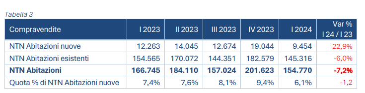 Sul mercato nazionale sono state compravendute quasi 155 mila abitazioni, circa 12 mila in meno rispetto allo stesso periodo del 2023 (-7,2%).