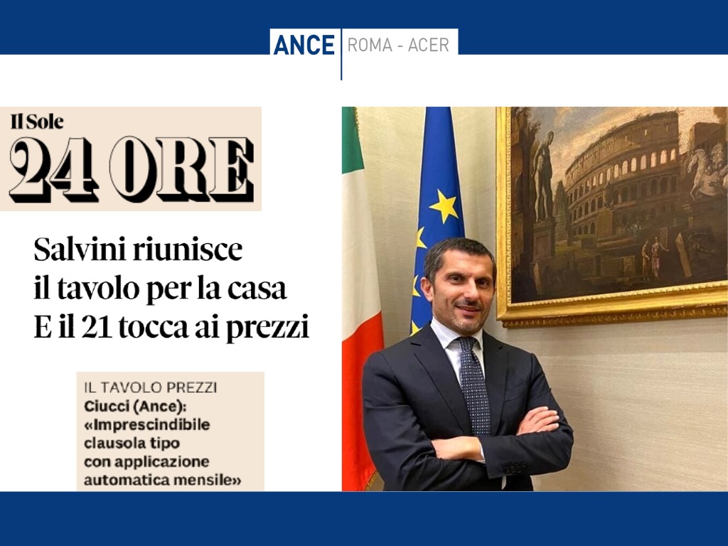 Revisione prezzi per le costruzioni, il MIT convoca tavolo di lavoro. Ciucci (delegato Ance) sul “Sole 24 Ore”: “Proposto metodo alla francese. Imprescindibile clausola tipo con indici rappresentativi delle varie tipologie di opera e applicazione automatica mensile”