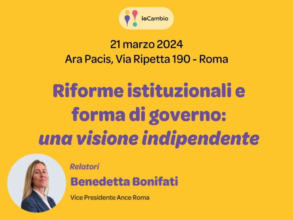 C’è anche la Vicepresidente Ance Roma – ACER, Benedetta Bonifati, tra i relatori dell’incontro “Riforme istituzionali e forma di governo: una visione indipendente”, evento di lancio dell’associazione “ioCambio”, nata per promuovere stabilità ed efficacia dei governi. L’appuntamento è per giovedì 21 marzo, dalle ore 10.30 alle 13, all’Ara Pacis (via Ripetta 190, Roma).