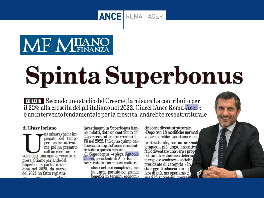“Spinta Superbonus” – Intervista del Presidente Ance Roma – ACER, Ciucci a MF (Milano Finanza): “Intervento fondamentale per la crescita, andrebbe reso strutturale”