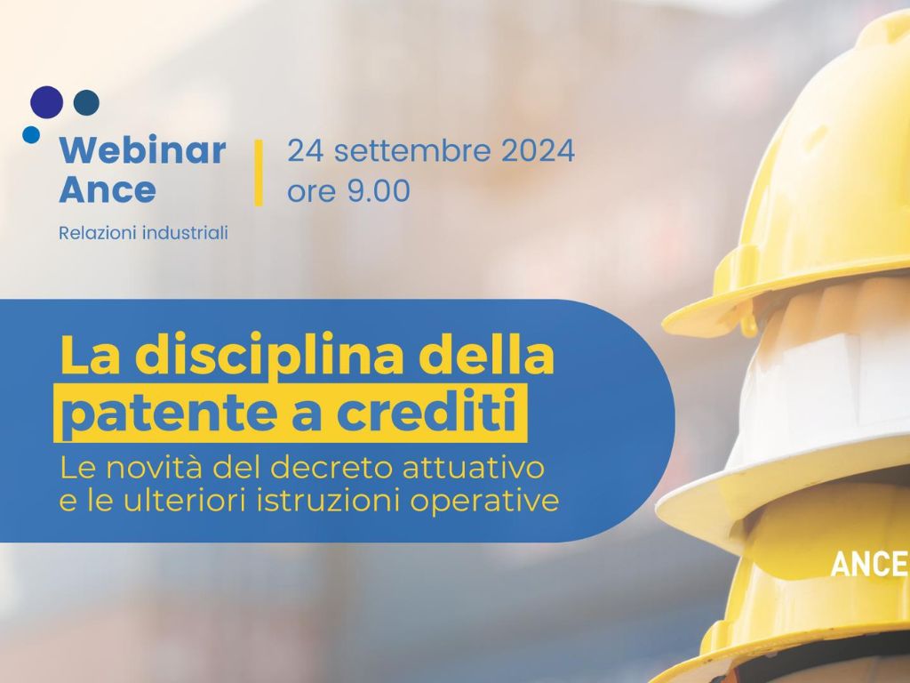 Tutti i dettagli, e il form da compilare per registrarsi, sul sito Ance: https://ance.it/2024/09/tutte-le-nuove-disposizioni-sulla-patente-a-crediti-il-webinar-ance/